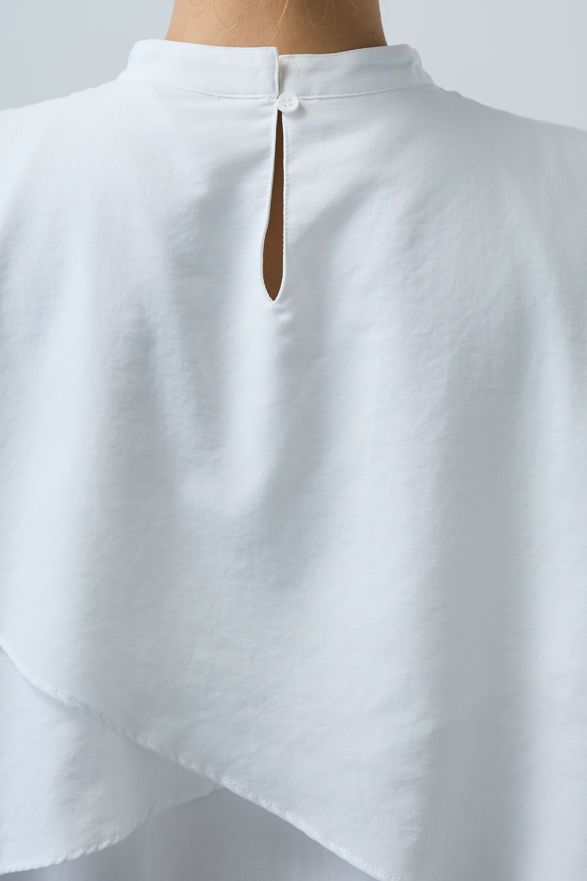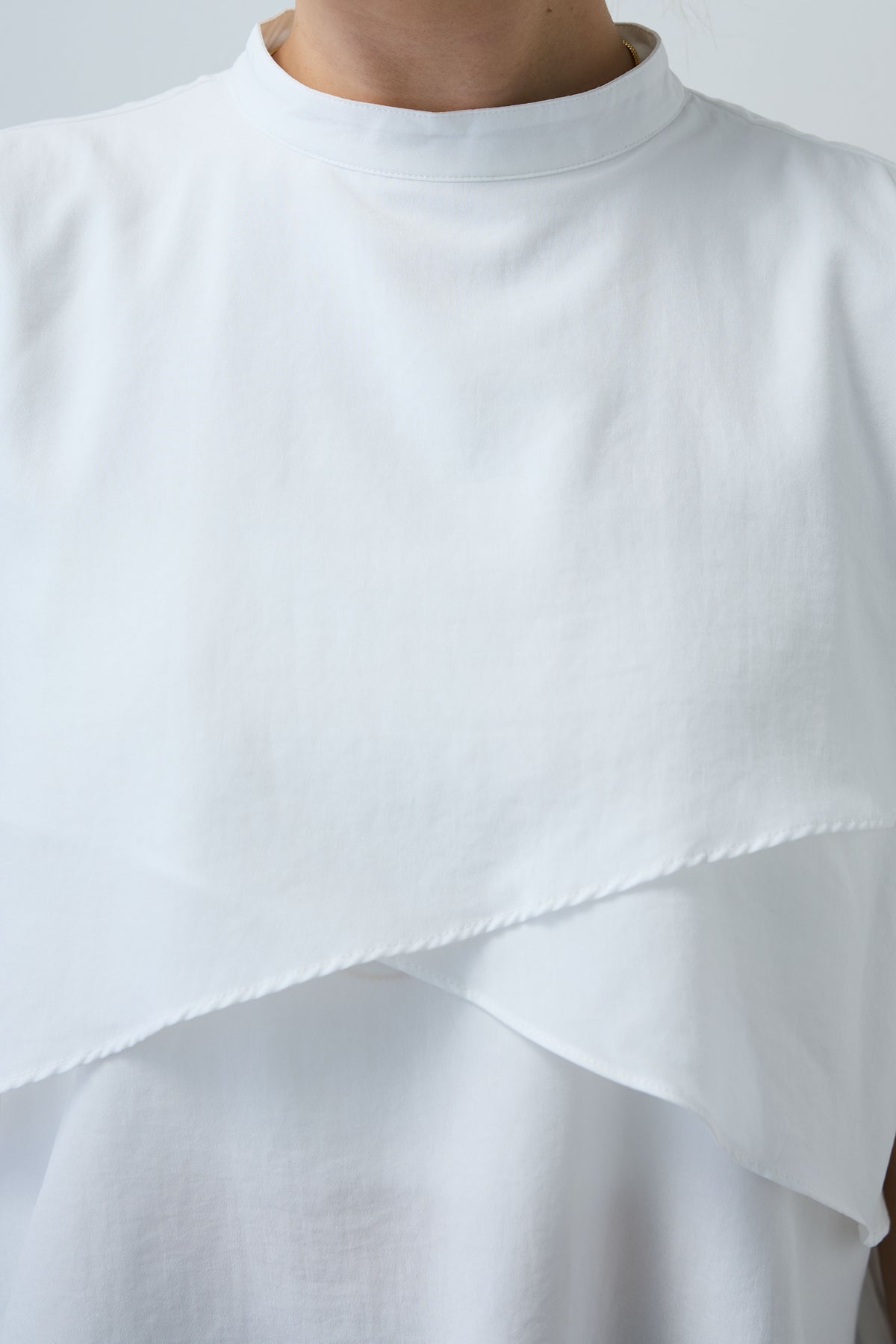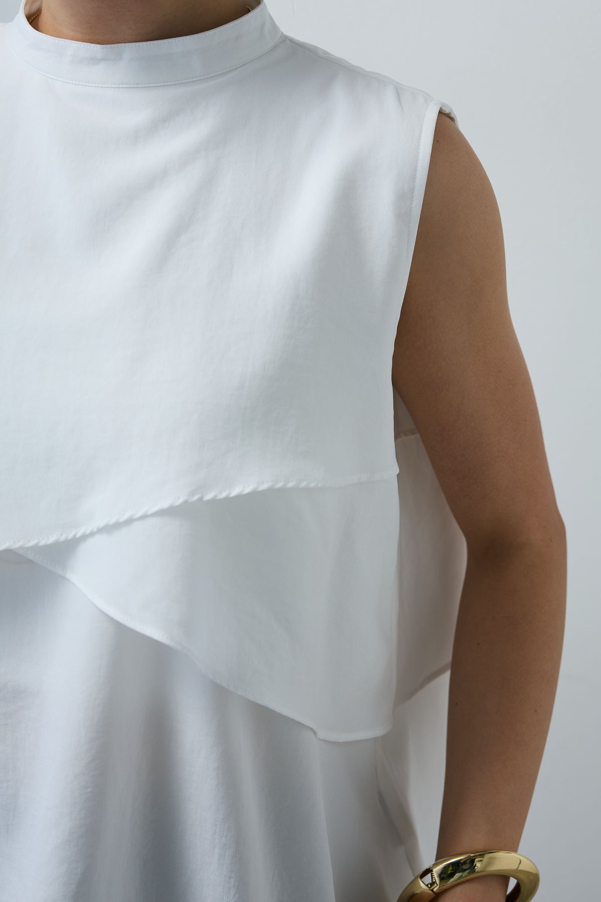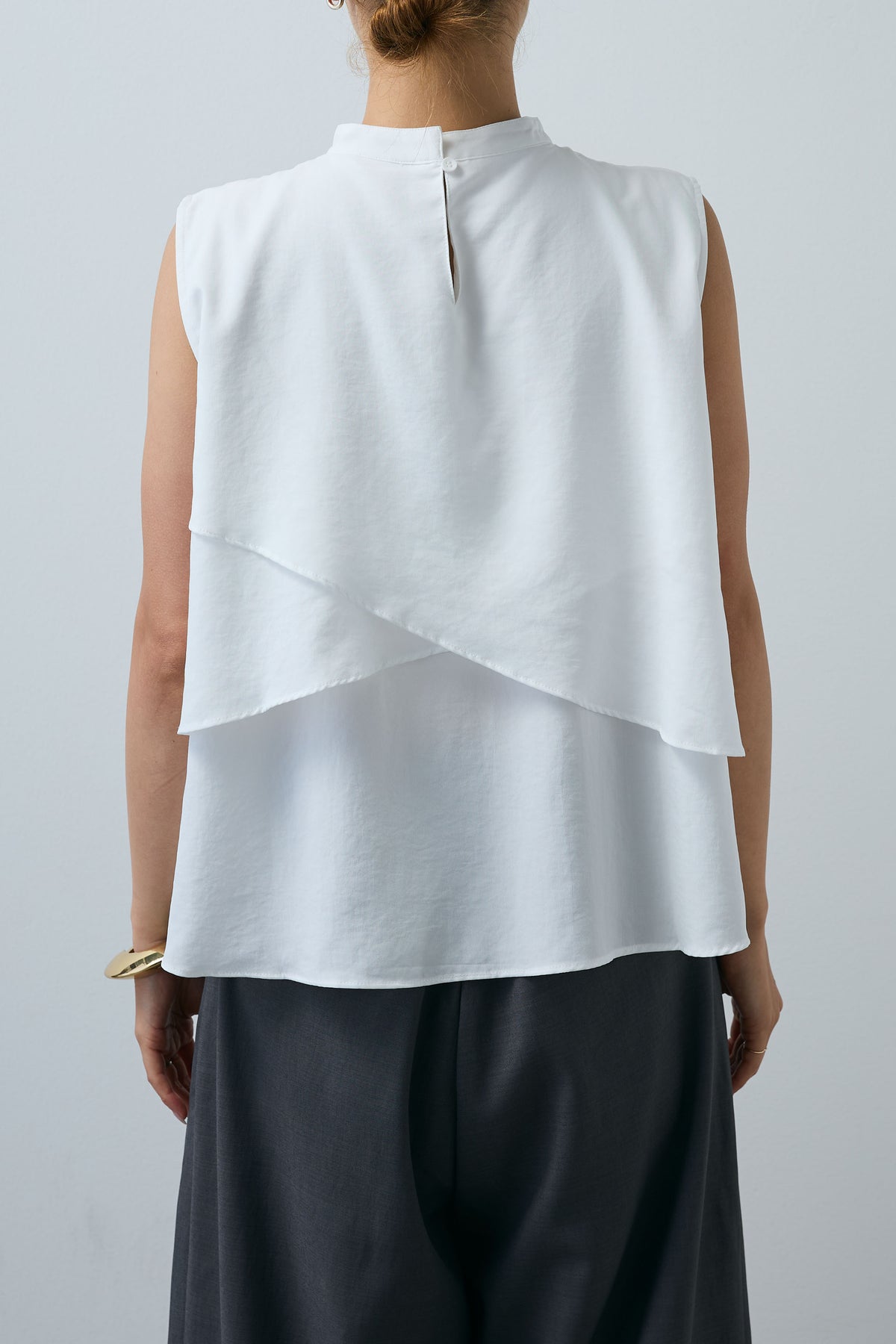 動きのあるアシンメトリーフレアが目を惹くノースリーブブラウス。シンプルながらも計算された立体感が、着るだけで印象的なスタイルに。さらりと軽やかな素材感で、一枚で着映えが叶う万能アイテムです。