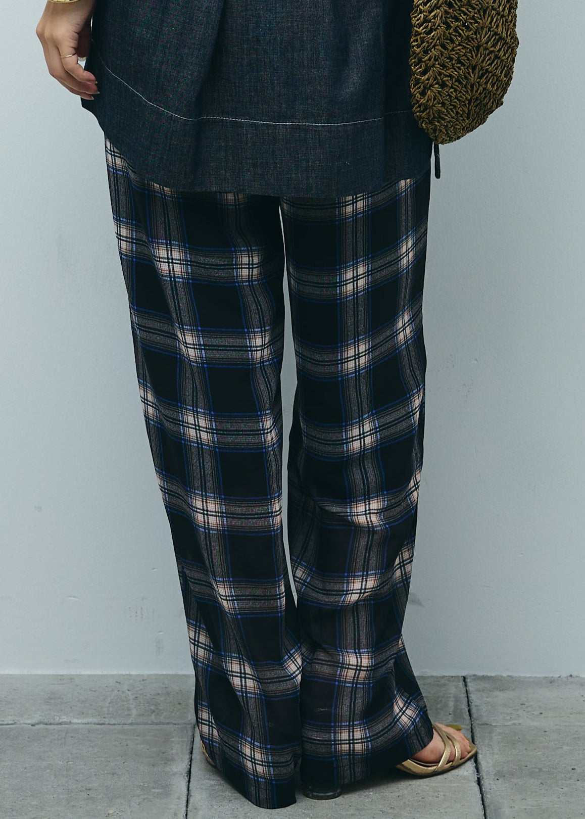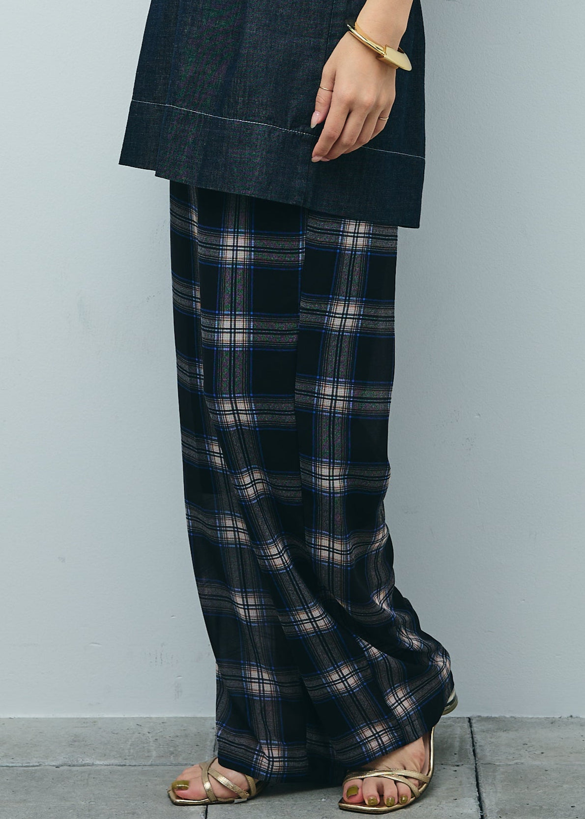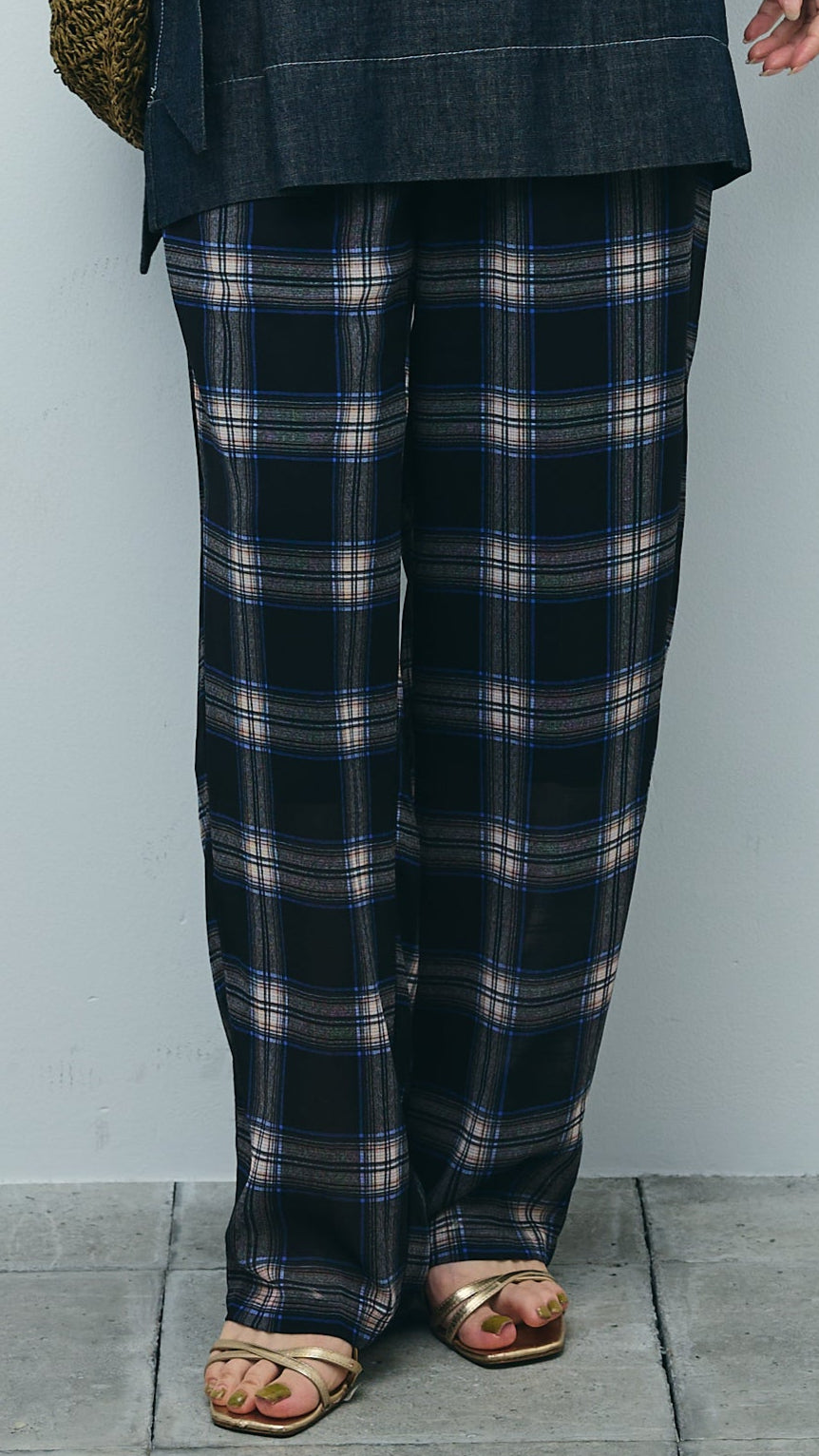 透け感のある素材にタータンチェックをあしらったワイドパンツ。軽やかな生地感が動きに合わせて揺れ、スタイリングに抜け感をプラスします。ウエストはイージー仕様で、快適なはき心地も魅力の一枚です。