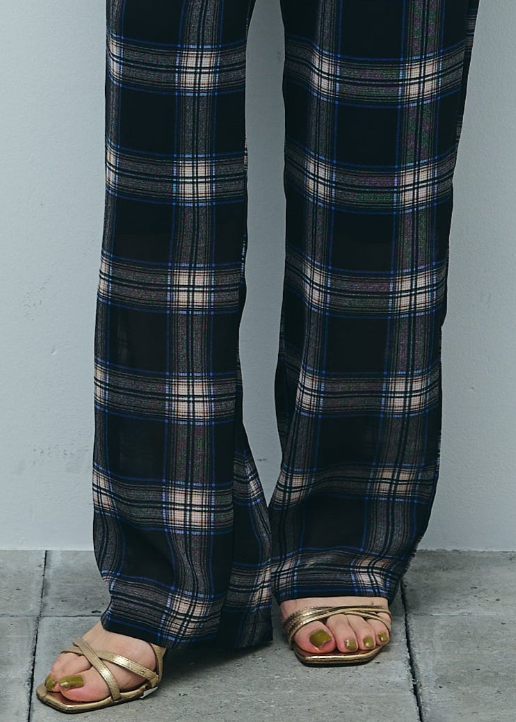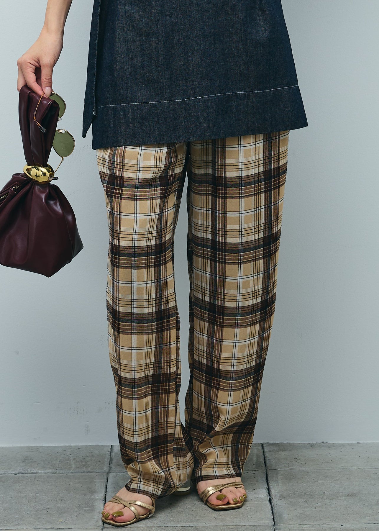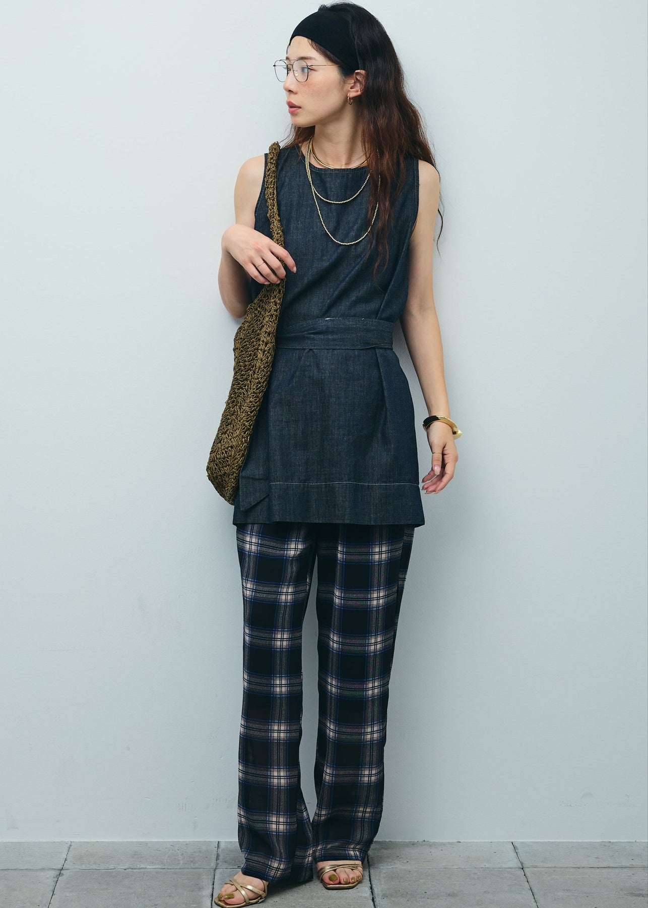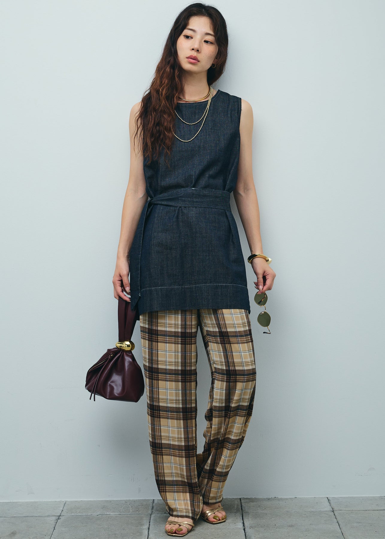 透け感のある素材にタータンチェックをあしらったワイドパンツ。軽やかな生地感が動きに合わせて揺れ、スタイリングに抜け感をプラスします。ウエストはイージー仕様で、快適なはき心地も魅力の一枚です。