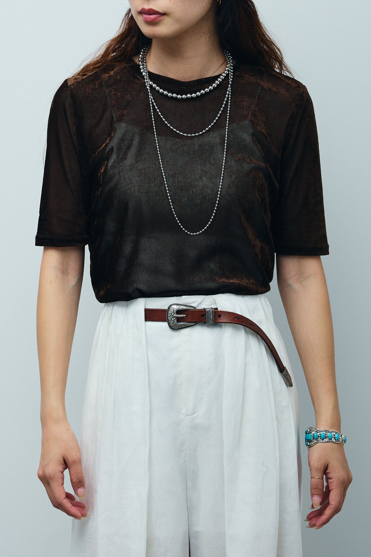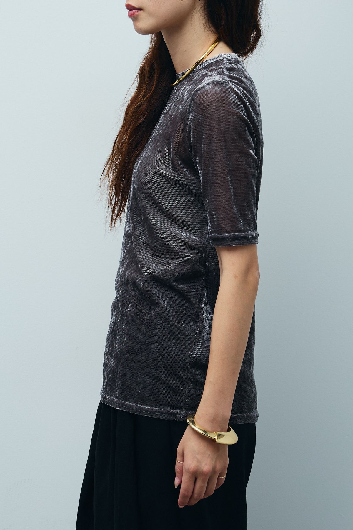 シアーベロアハーフスリーブTOPSは、透け感のあるベロア生地が特徴のトップスです。柔らかく上品な光沢感があり、カジュアルなコーディネートに華やかさを加えるアイテムです。シンプルでありながらも、アクセントとして使えるデザインです。
