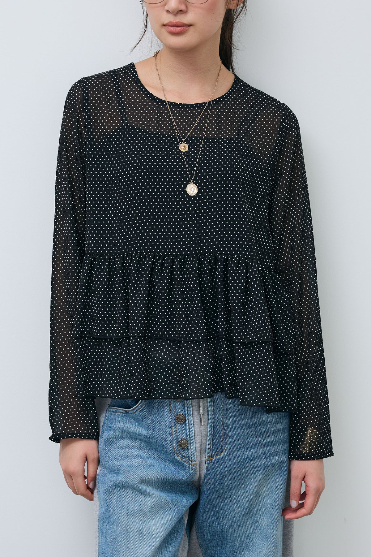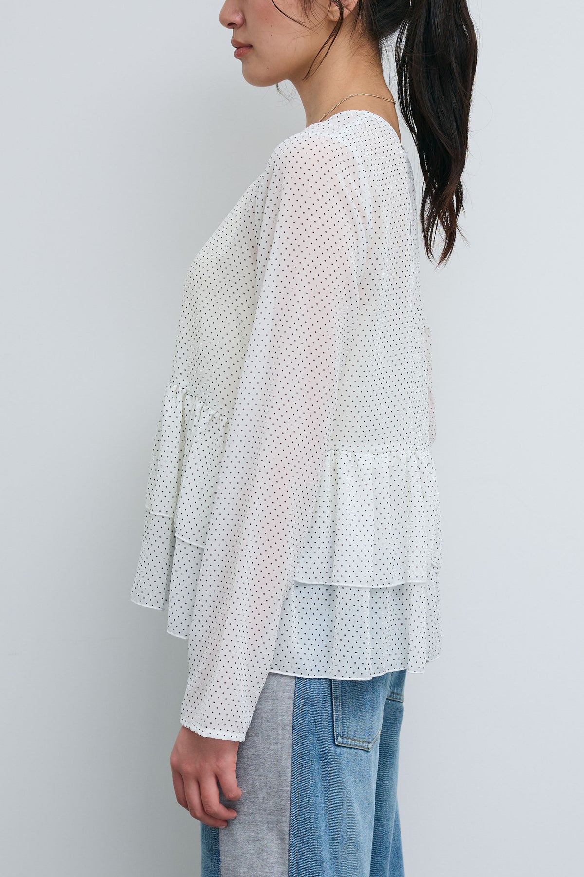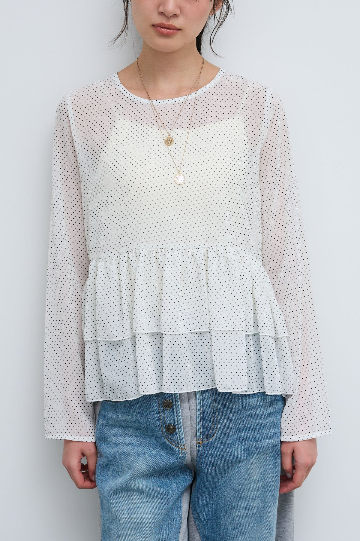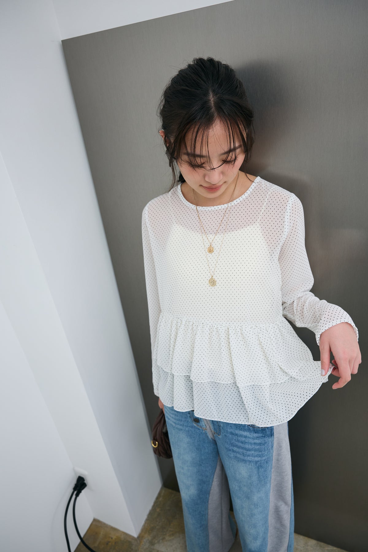軽やかに透けるシアー素材にドット柄を重ねた、表情豊かな一枚。程よいゆとりのあるシルエットが抜け感を生み、着るだけでこなれた印象に仕上がります。シンプルなボトムと合わせるだけで、さりげなく存在感を引き立ててくれるアイテムです。