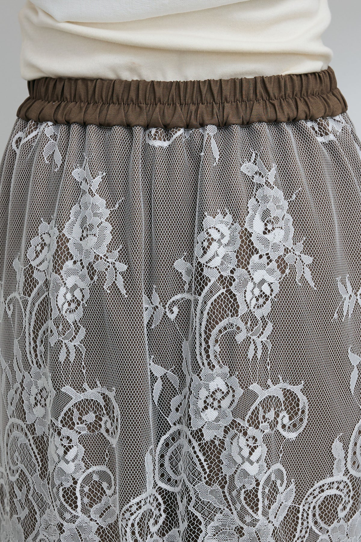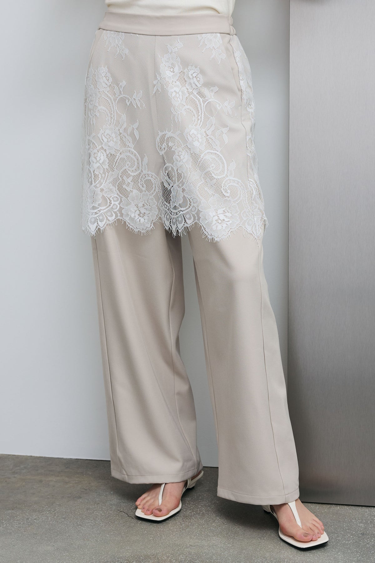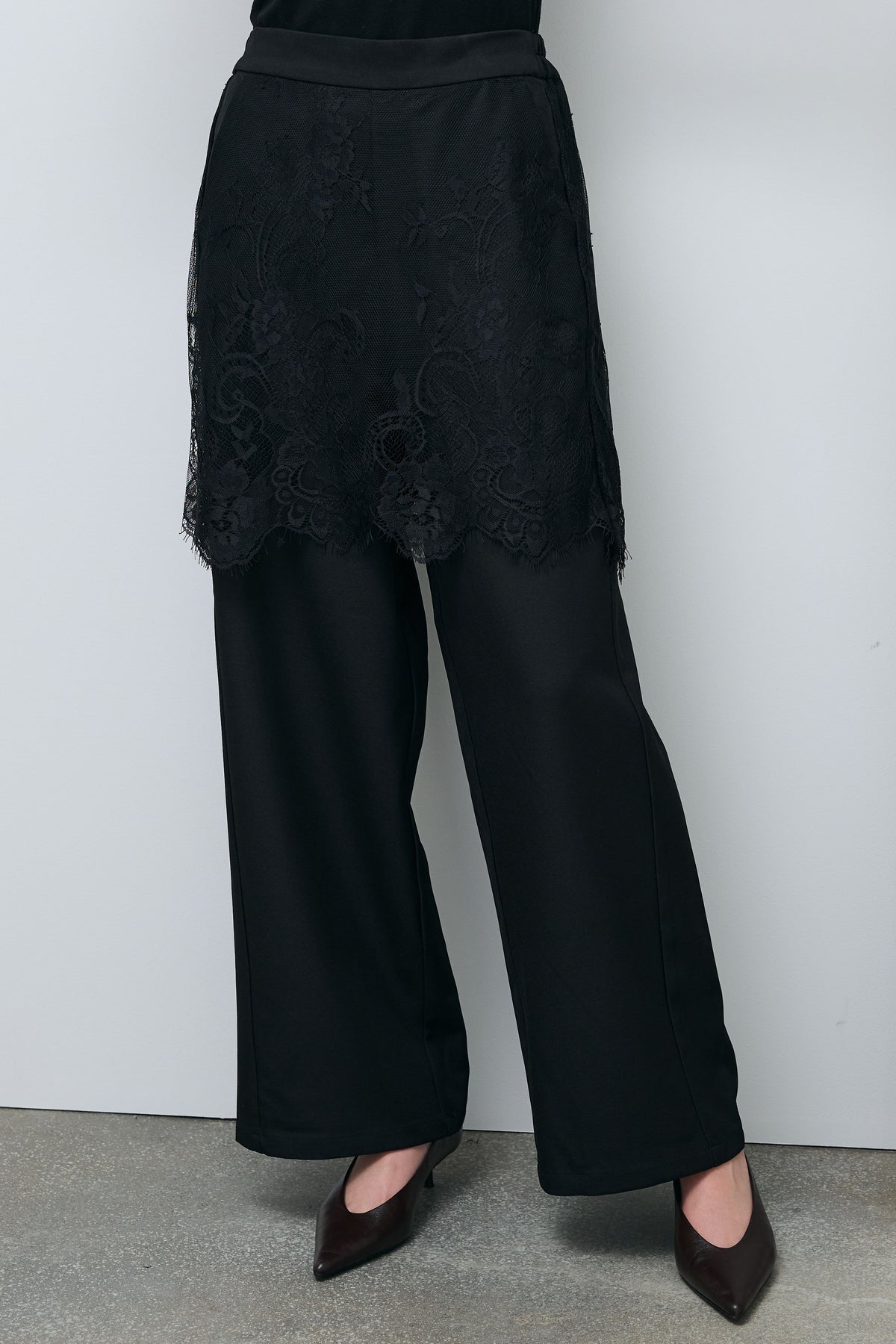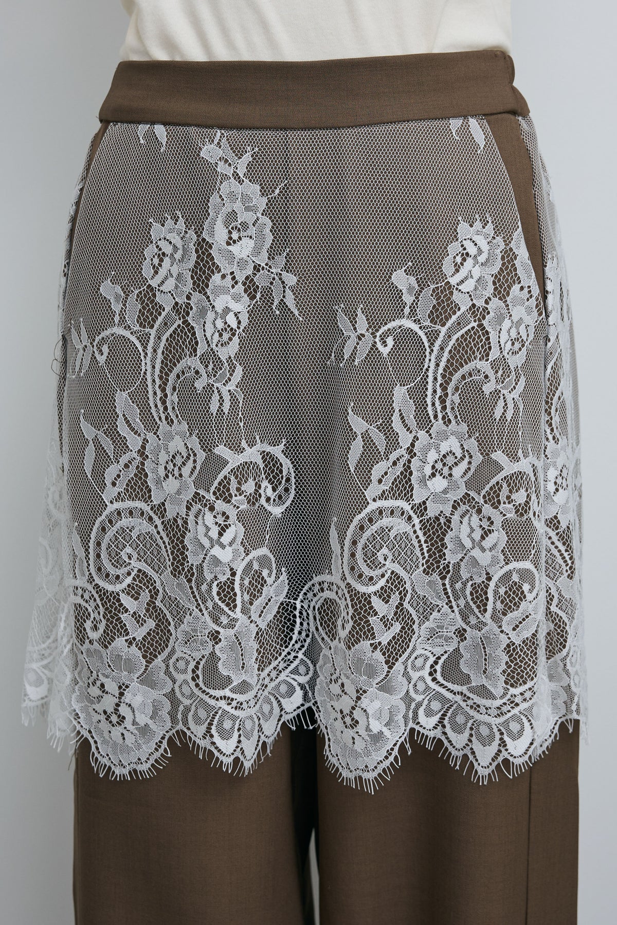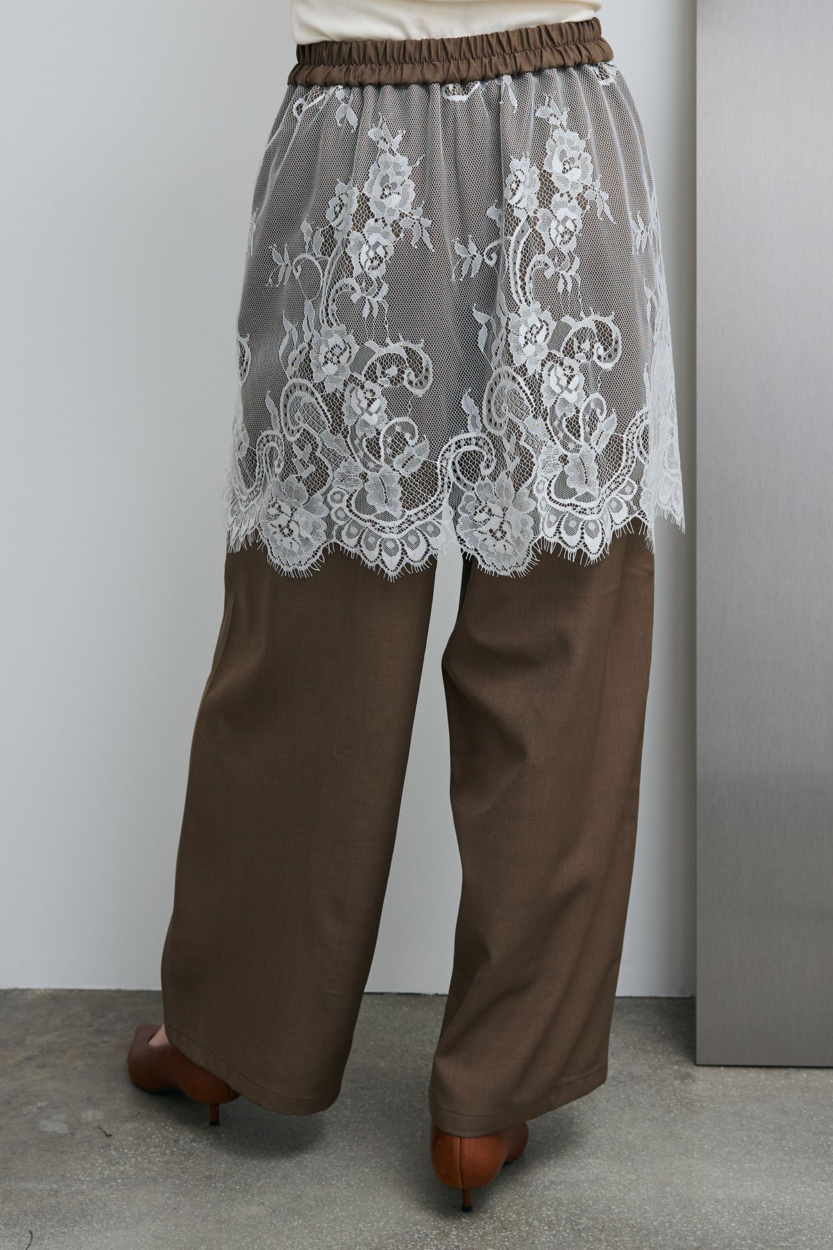 繊細なレースを重ねたデザインが目を引く一本。程よくハリのあるツイル素材とのコントラストが、奥行きのある表情を生み出します。ワイドシルエットで抜け感を持たせつつ、スタイリングにさりげない華やかさをプラスできるアイテムです。